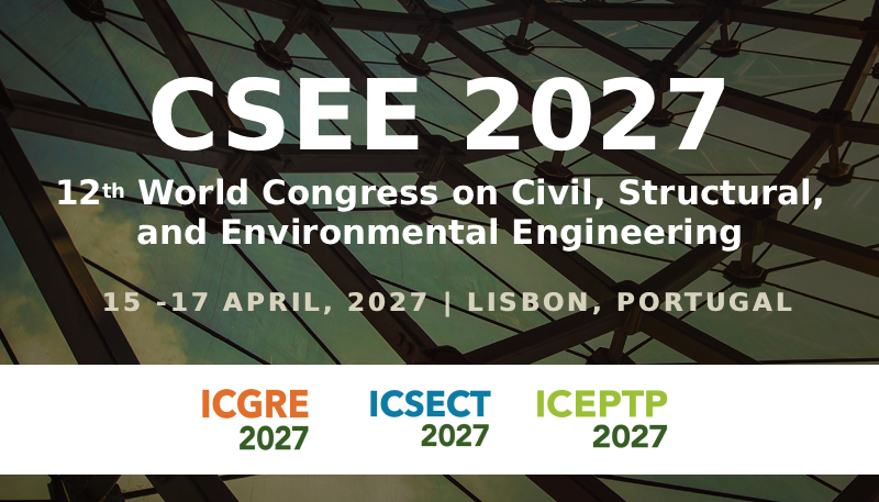 ICGRE'27: 12th International Conference on Geotechnical Research and Engineering (15 - 17 April 2027 | Lisbon, Portugal) ICSECT'27: 12th International Conference on Structural Engineering and Concrete Technology (15 - 17 April 2027 | Lisbon, Portugal) ICEPTP'27: 12th International Conference on Environmental Pollution, Treatment and Protection (15 - 17 April 2027 | Lisbon, Portugal)